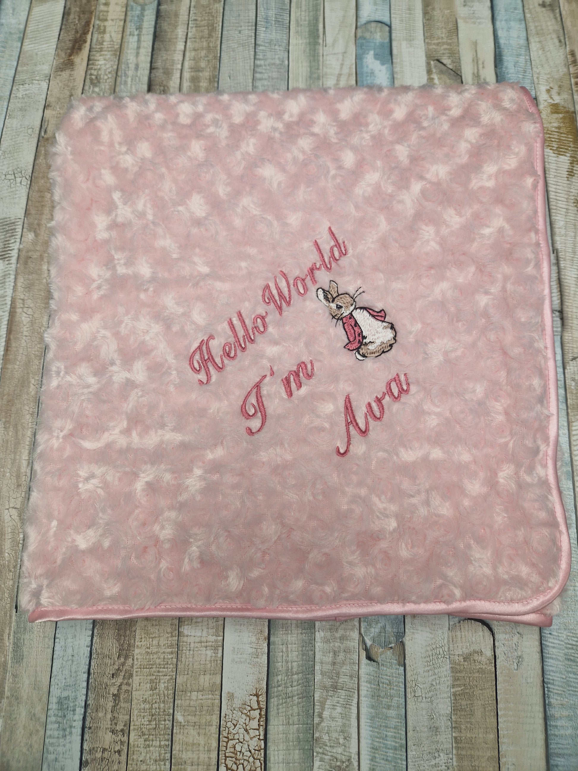 Personalised Hello World Pink Soft Rose Blanket/Wrap With Embroidered Pink Rabbit Design