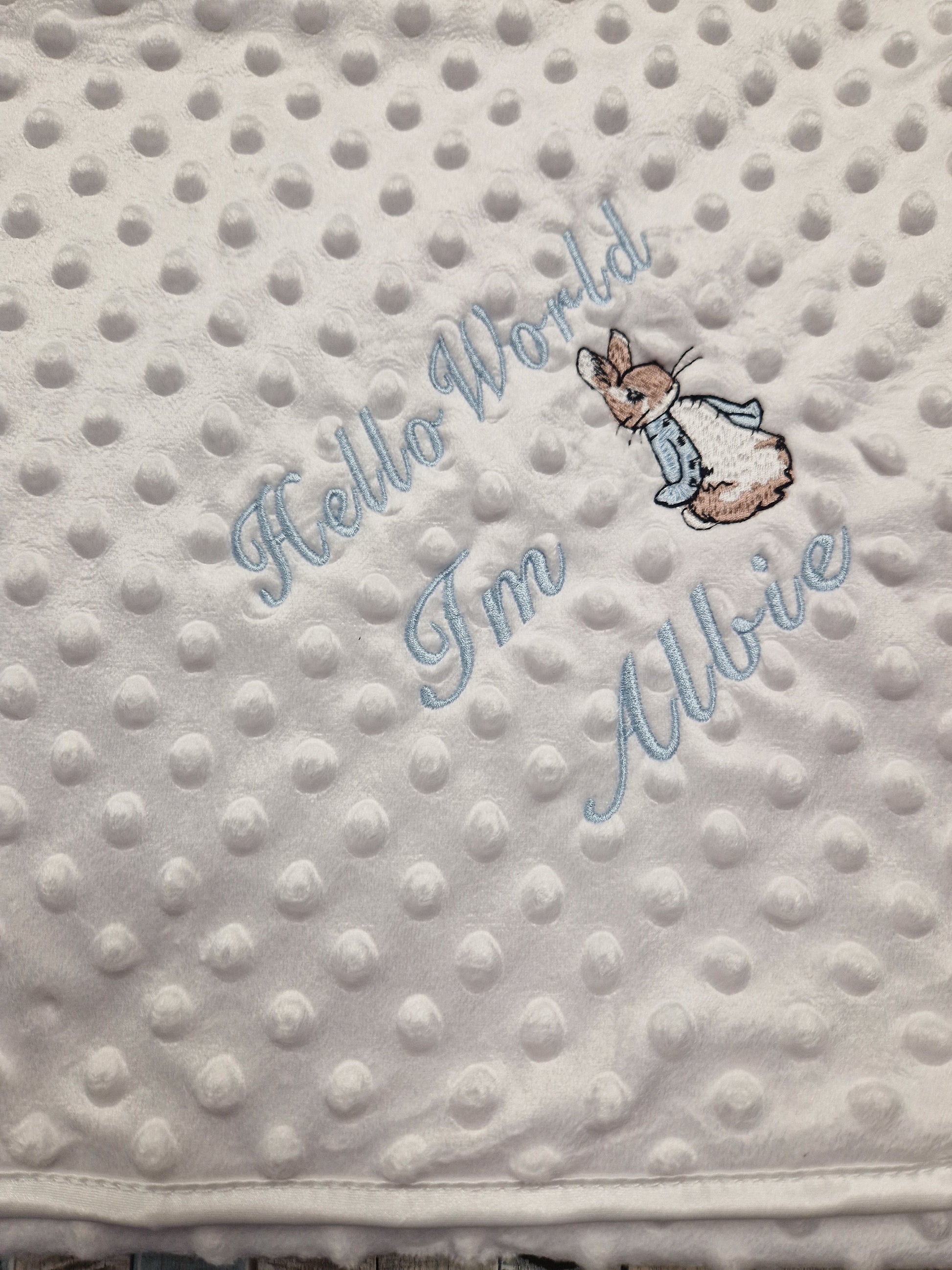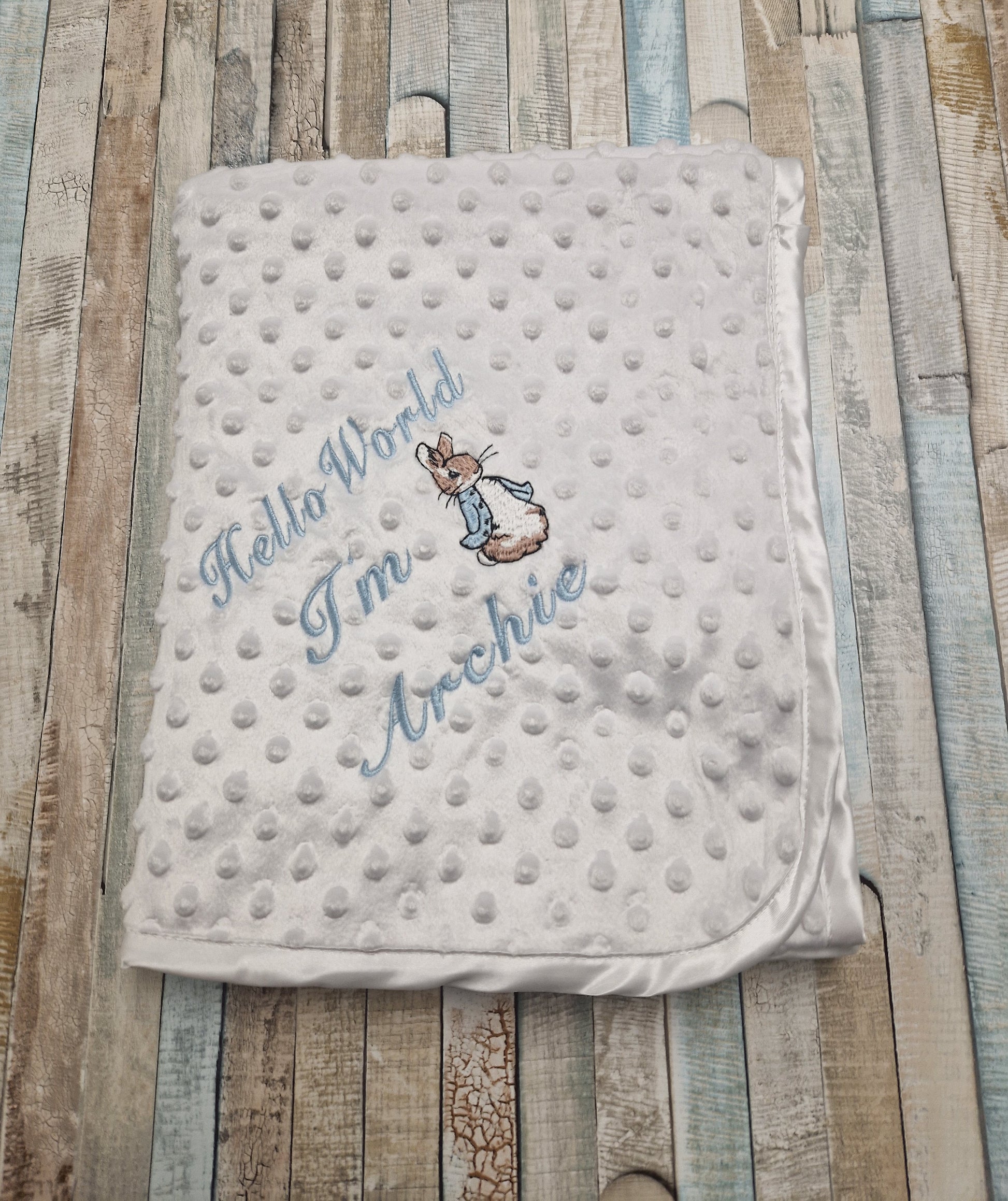 Personalised Hello World White Dimple Blanket/Wrap With Embroidered Blue Rabbit Design