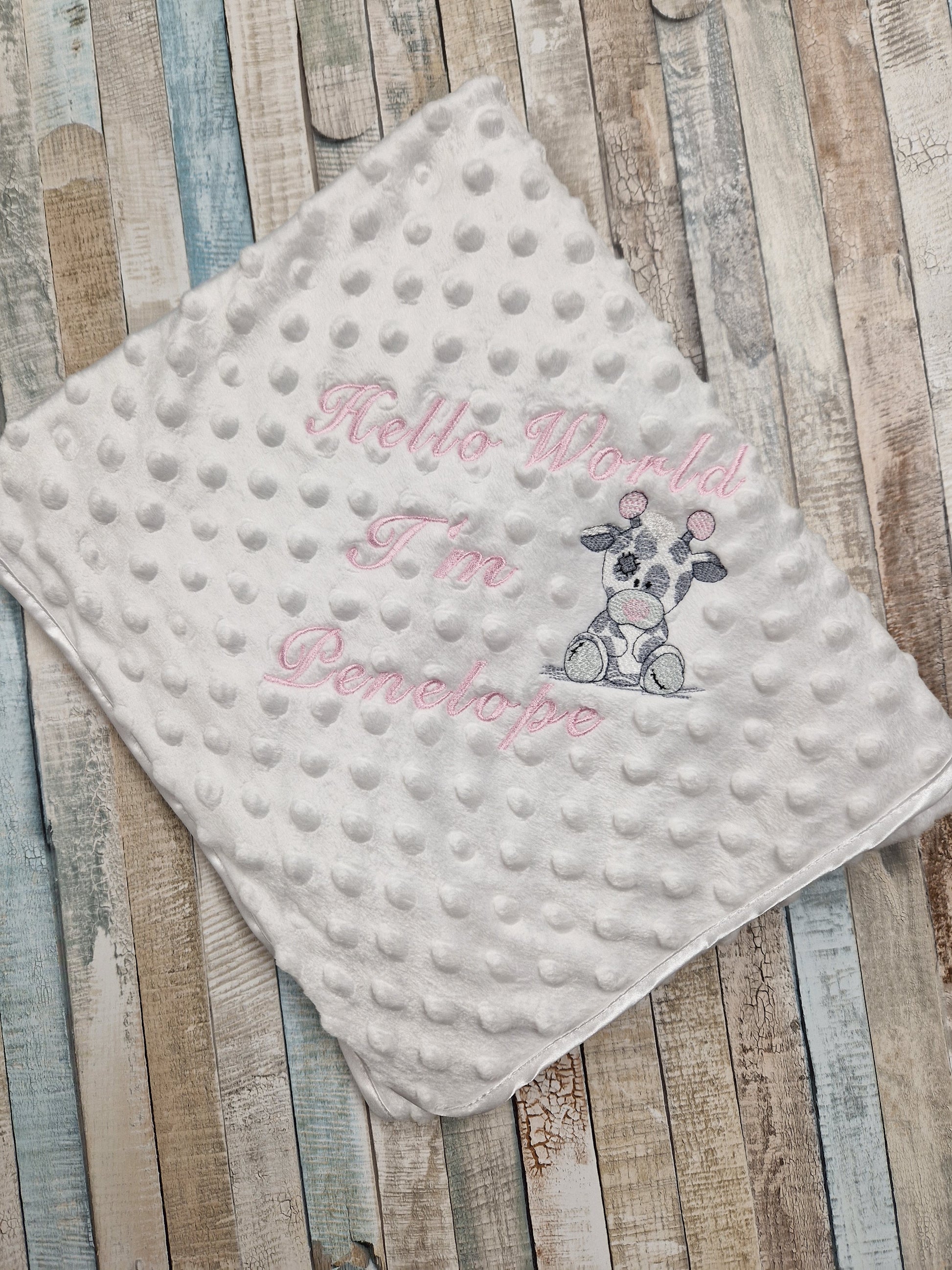 Personalised Hello World White Dimple Wrap With Pink Giraffe Embroidered Design