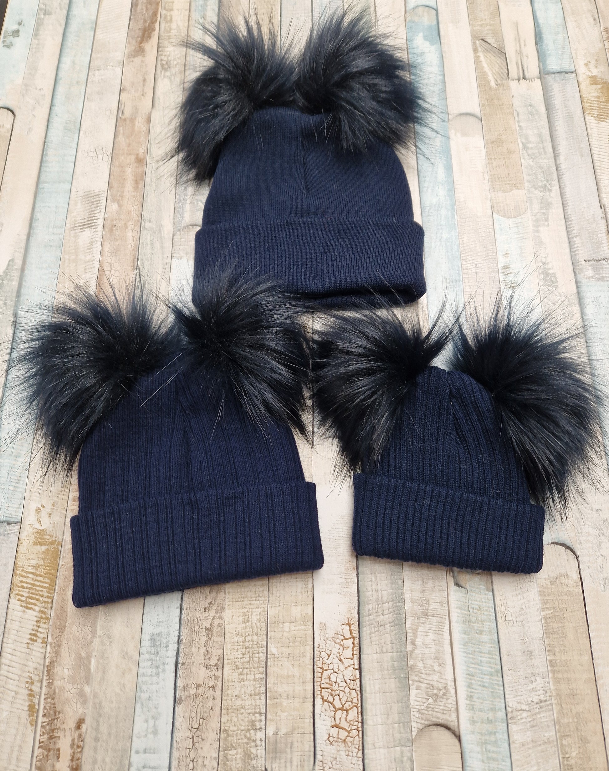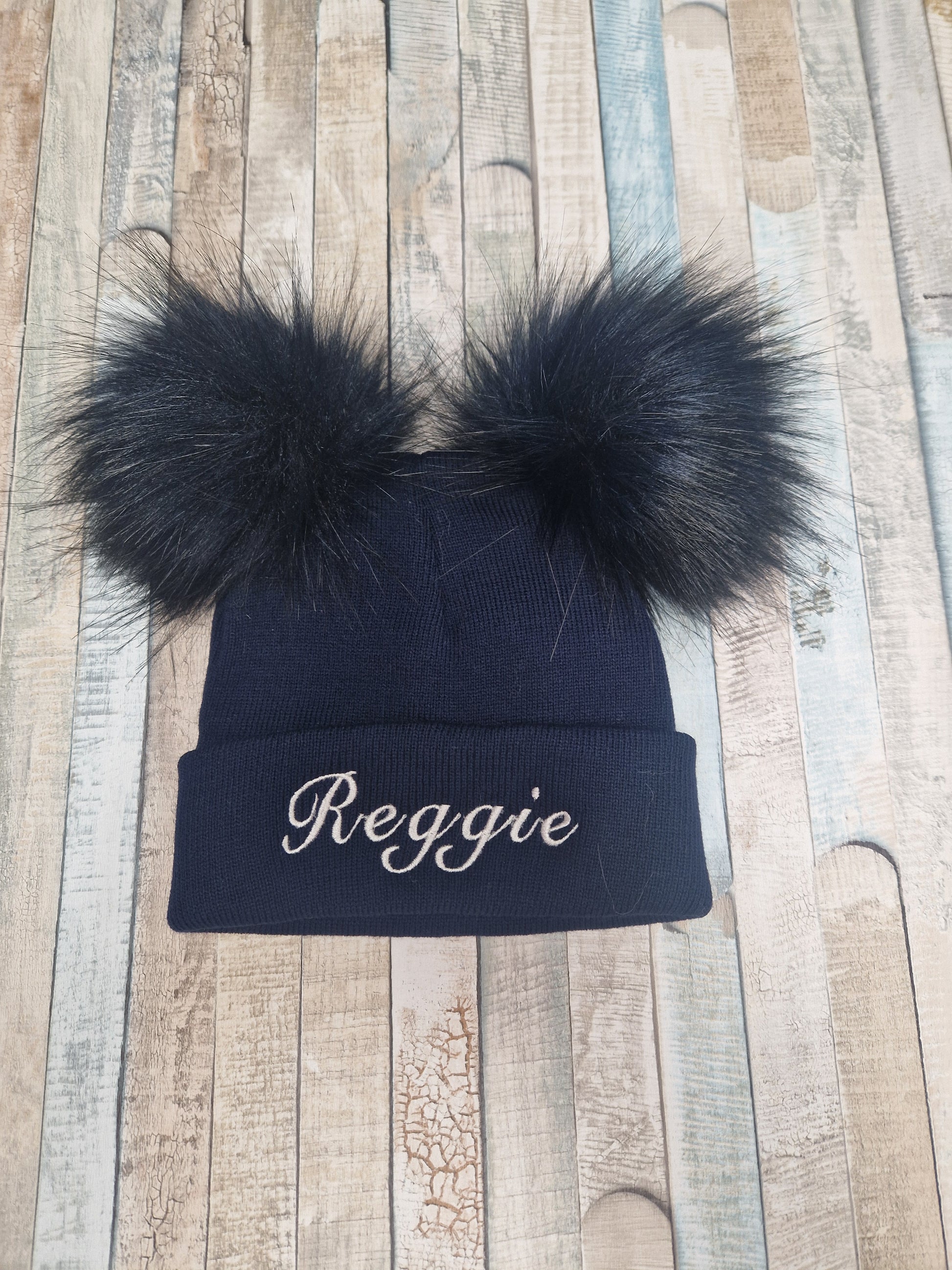Personalised Baby Navy Knitted Double Navy Fluffy Faux Fur Pom Hat