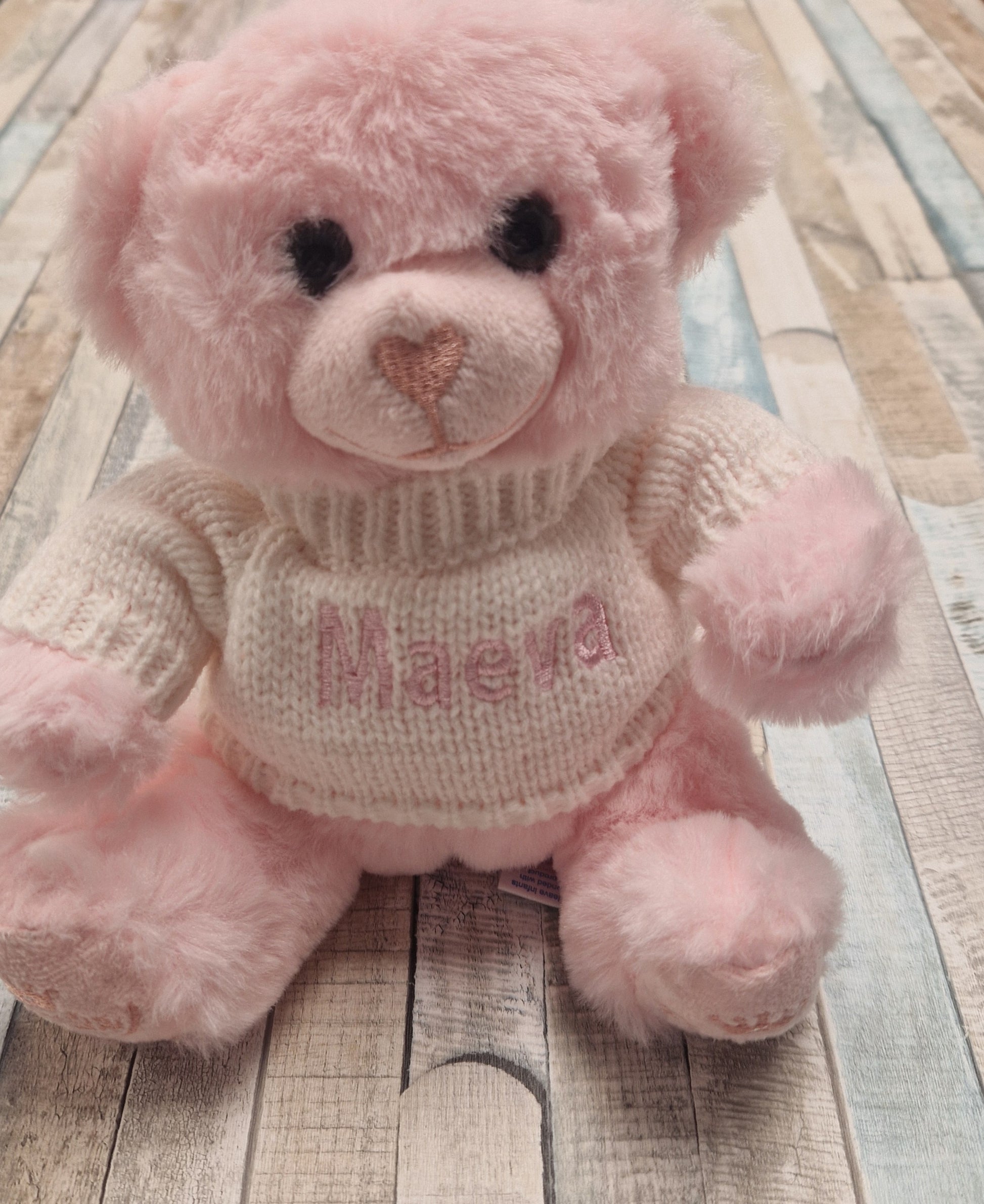 Pink soft teddy with jumper that can be personalised with name of your choice