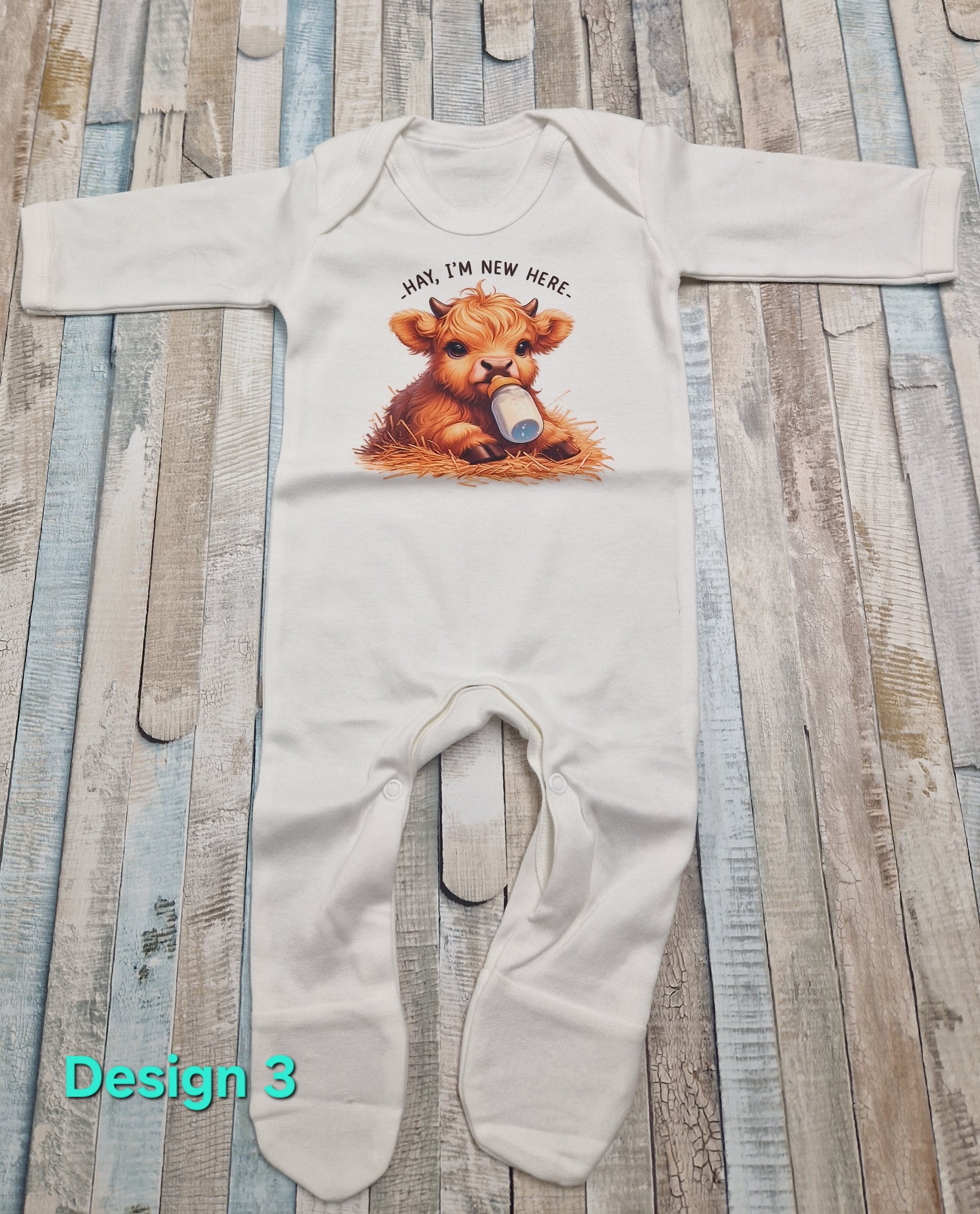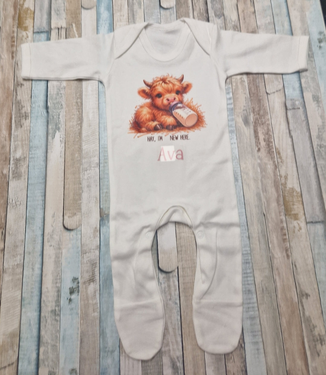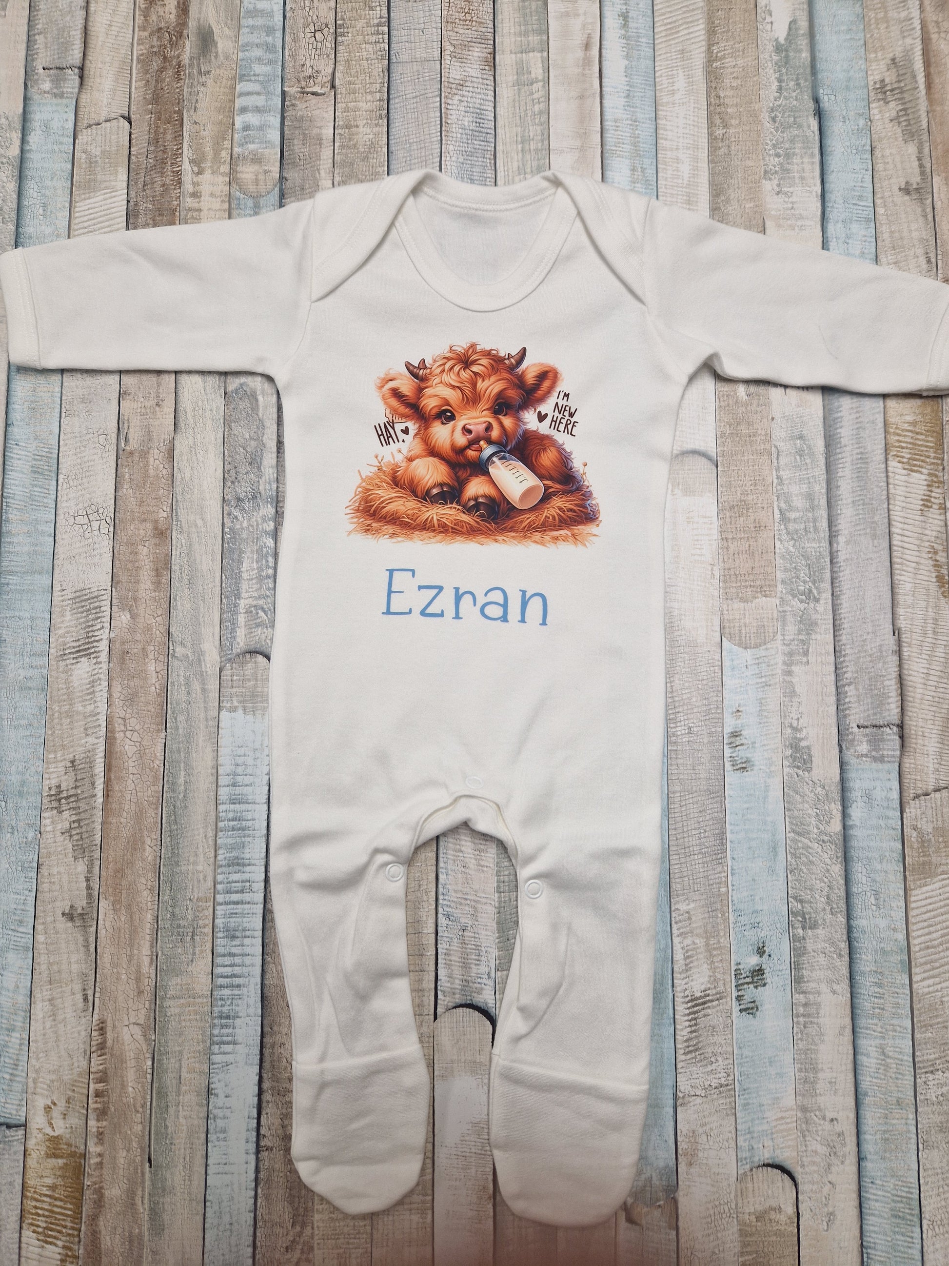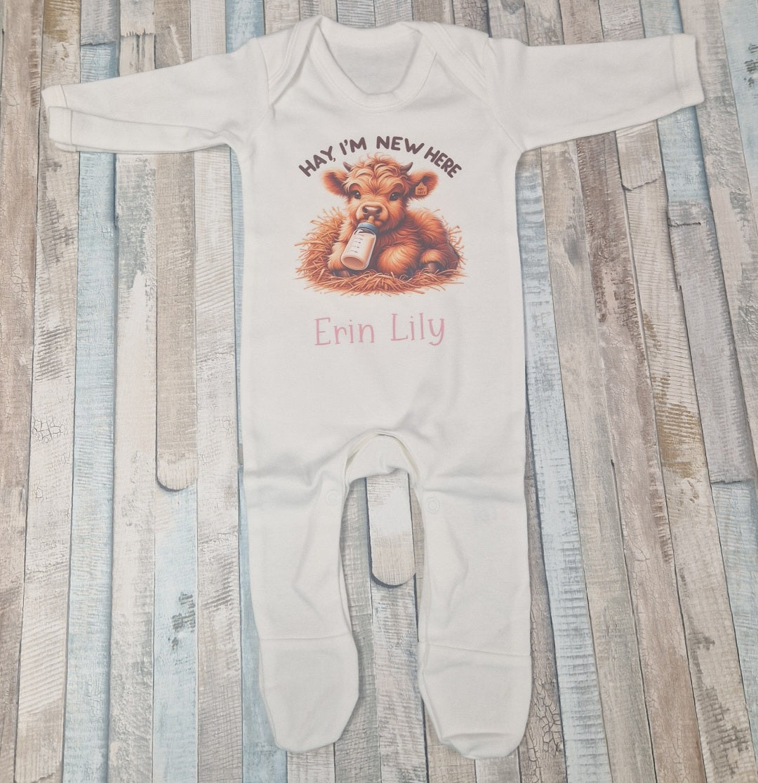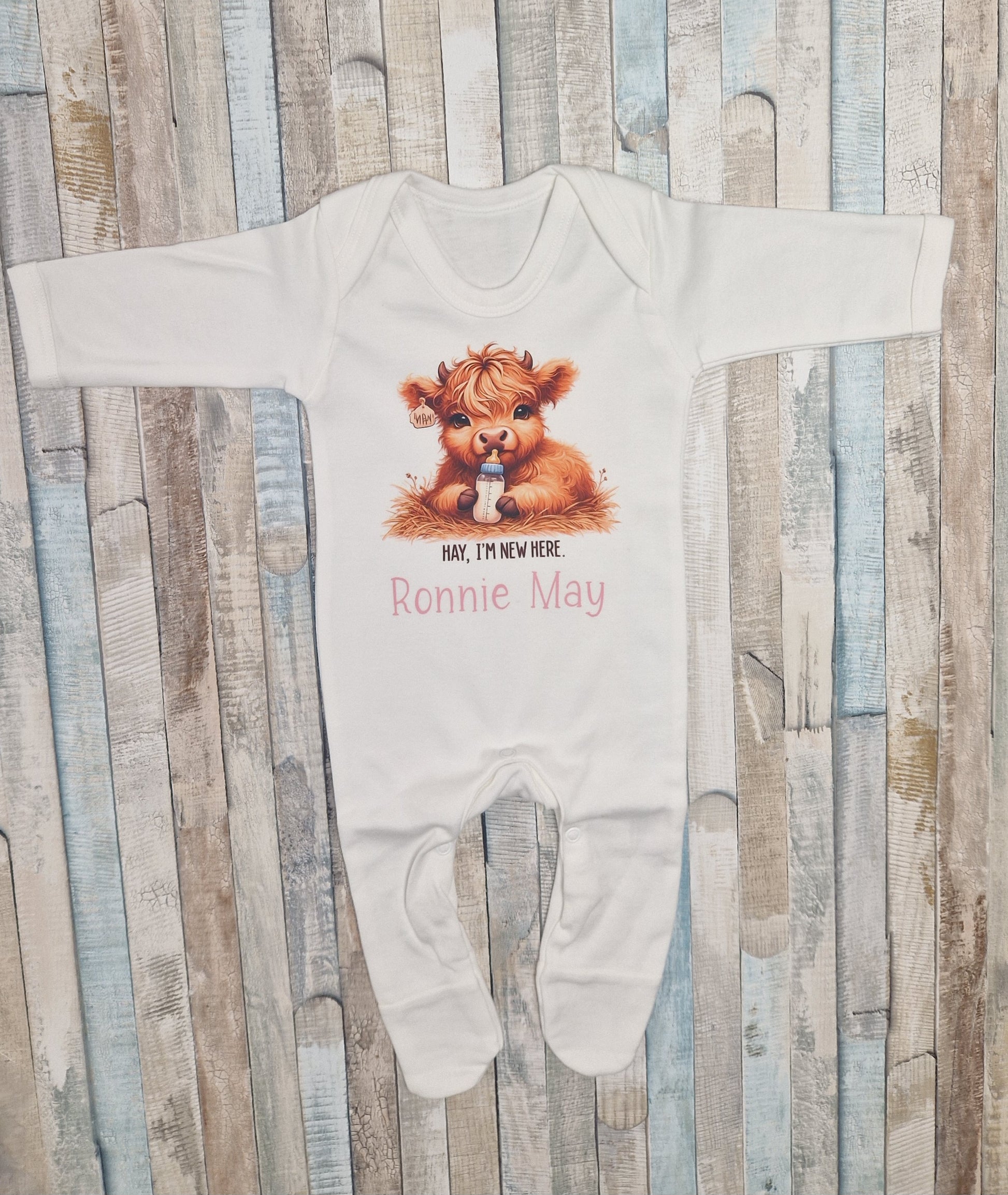 Personalised Baby Highland Cow Hay Im New Here Printed Newborn Babygro