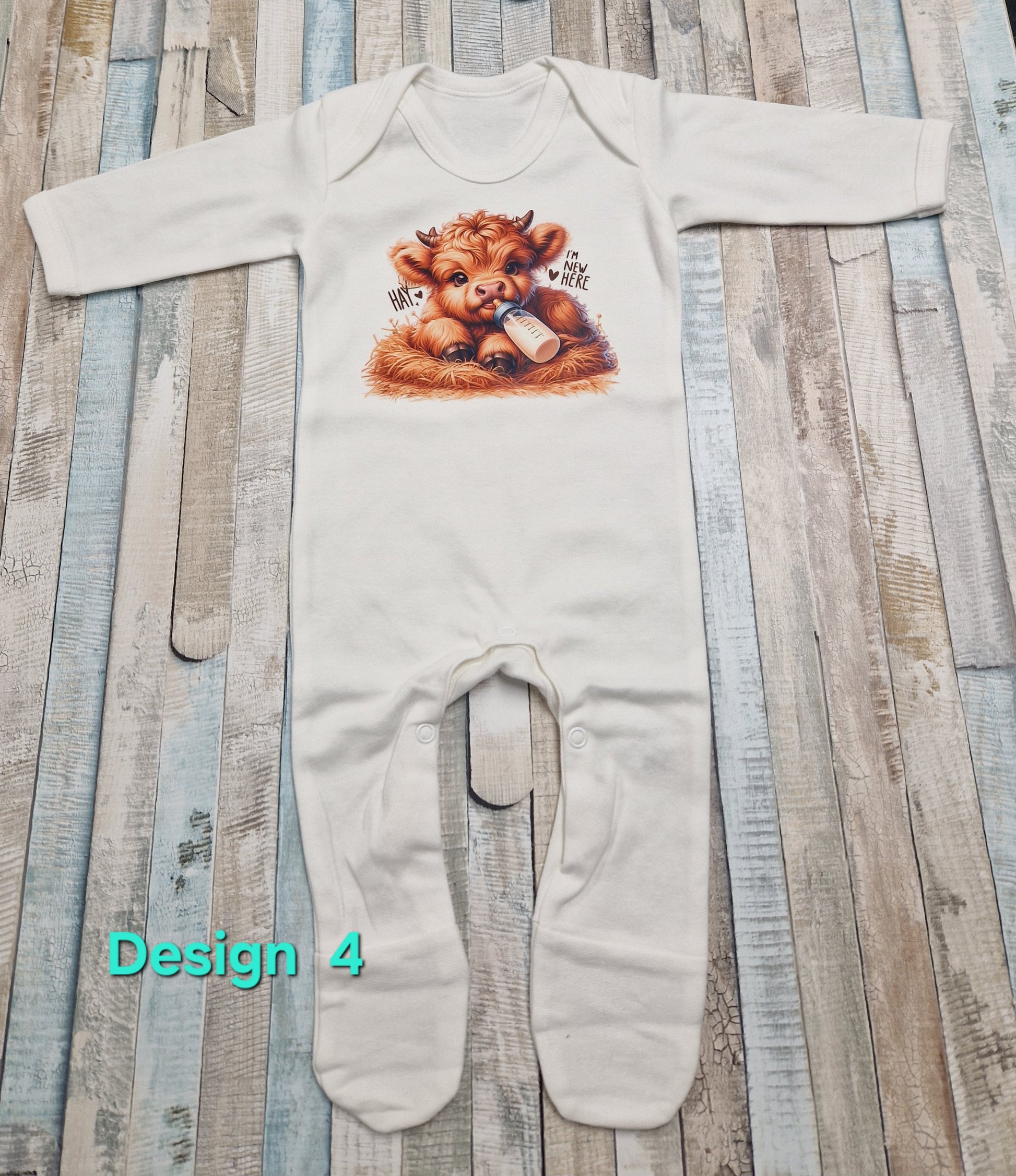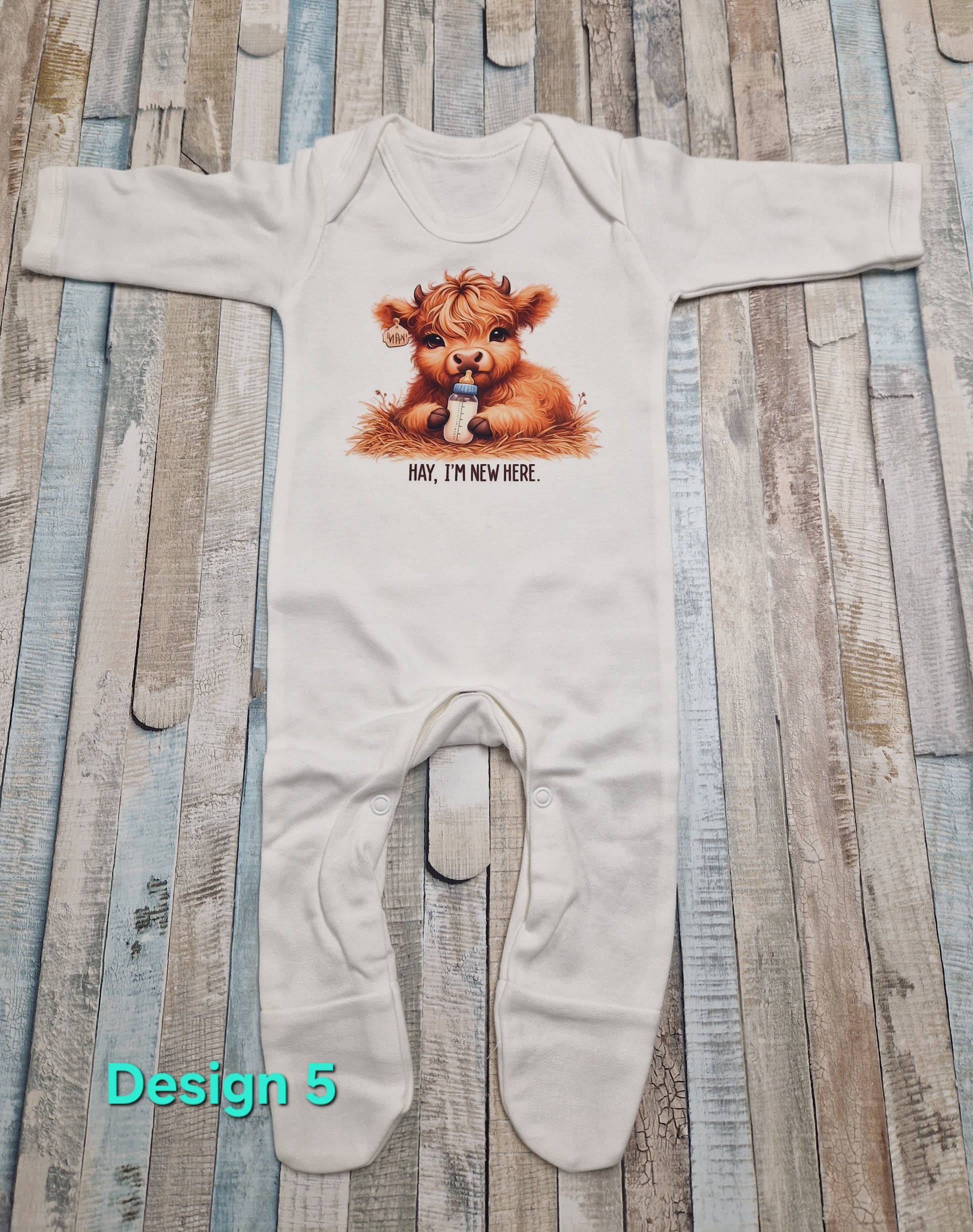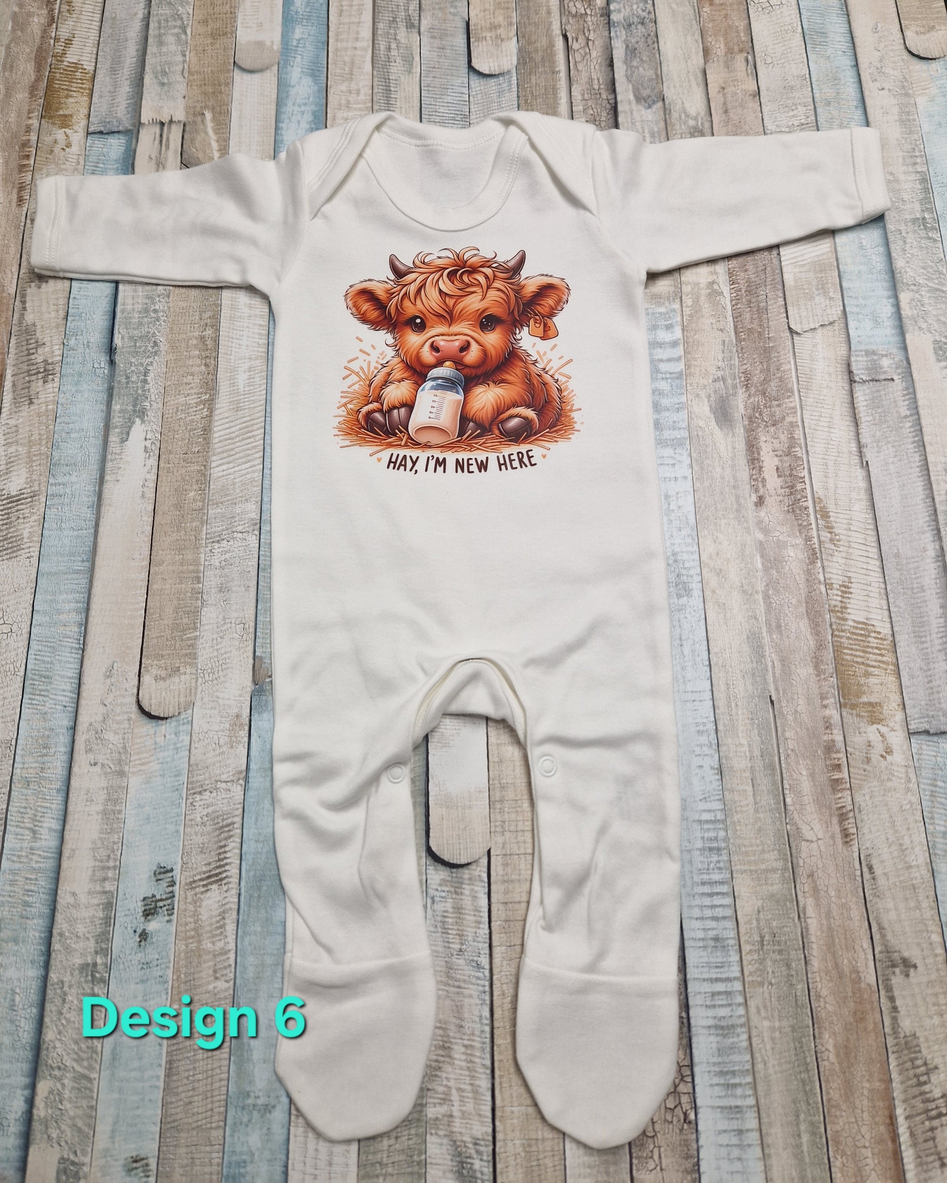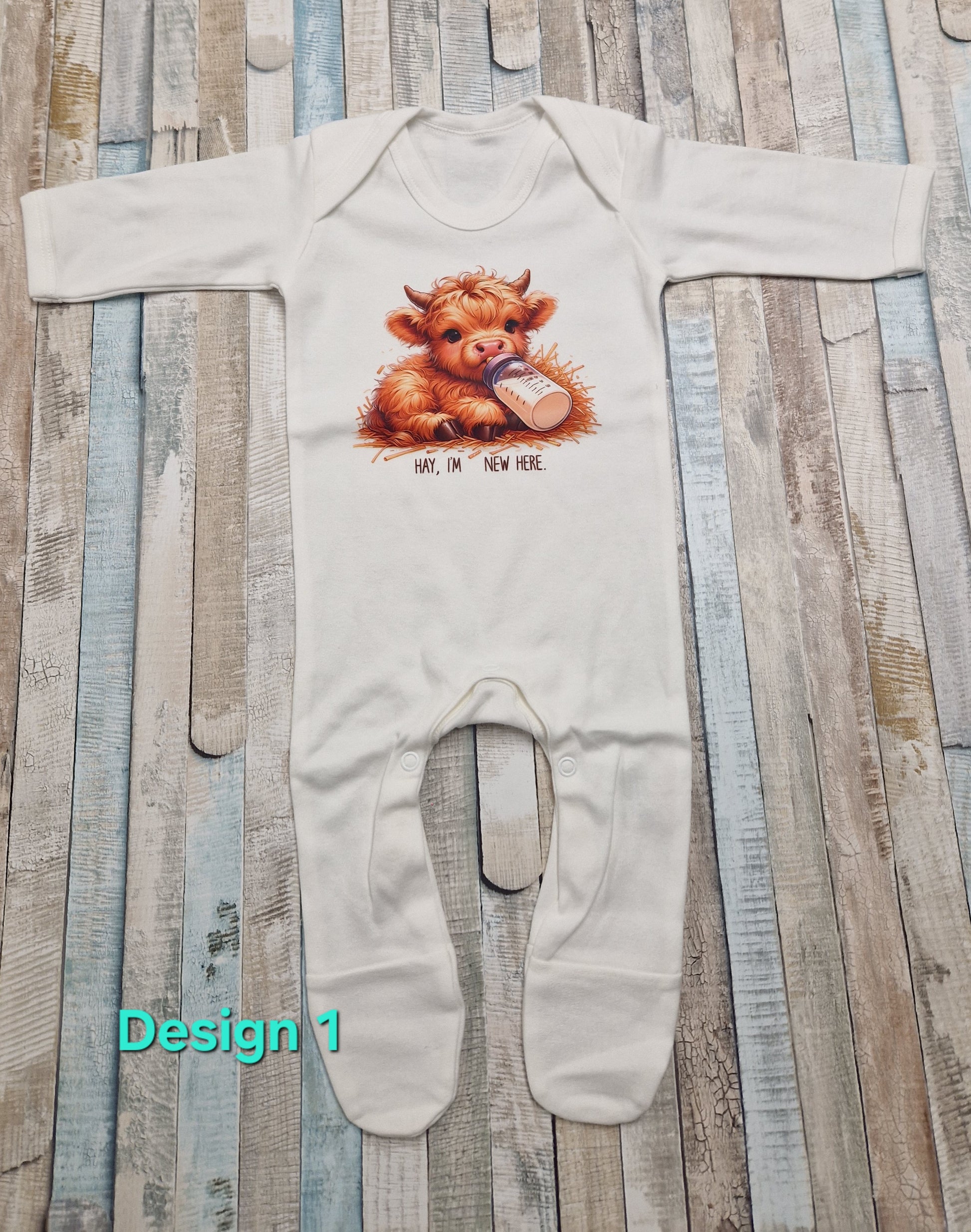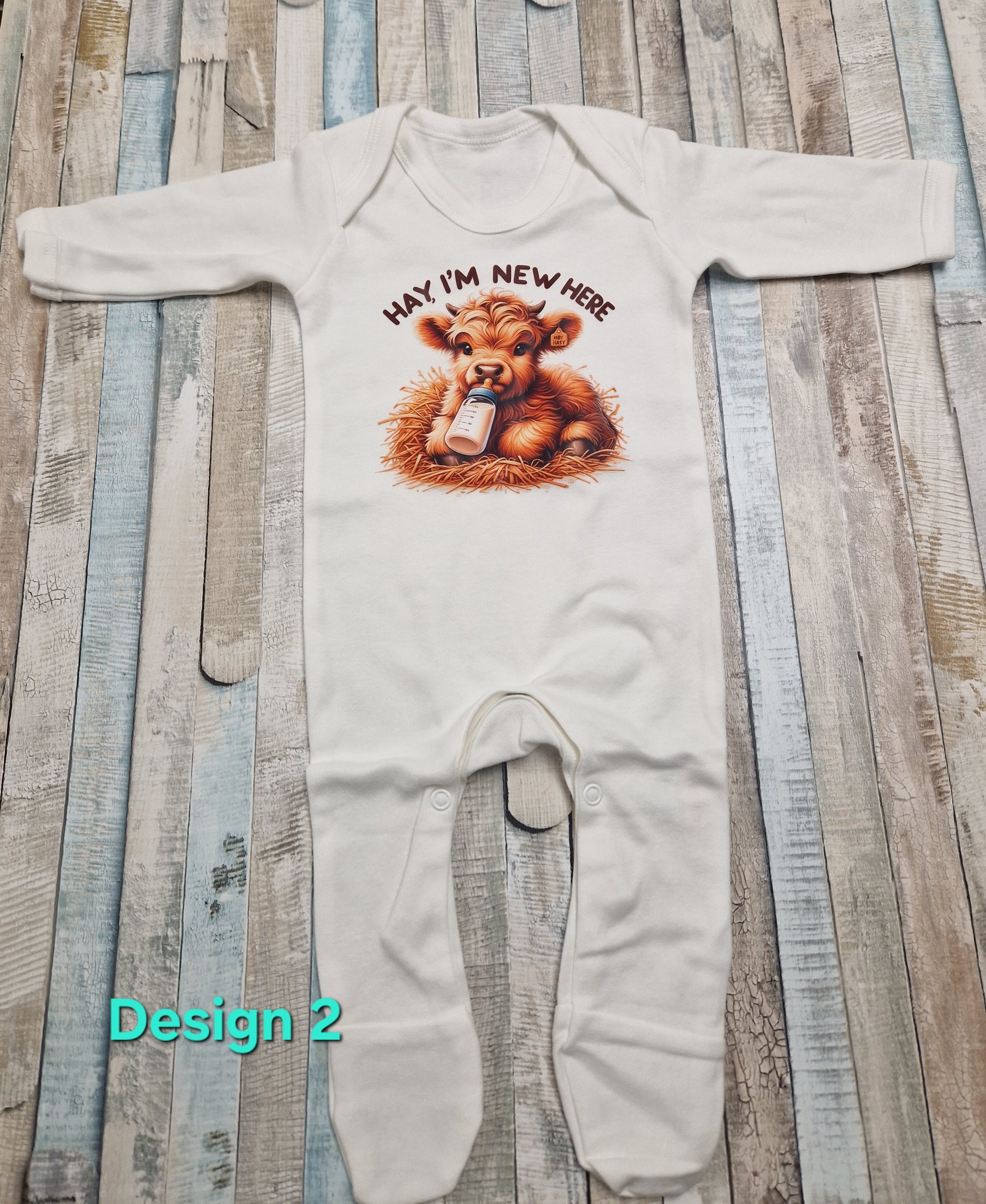 Personalised Baby Highland Cow Hay Im New Here Printed Newborn Babygro