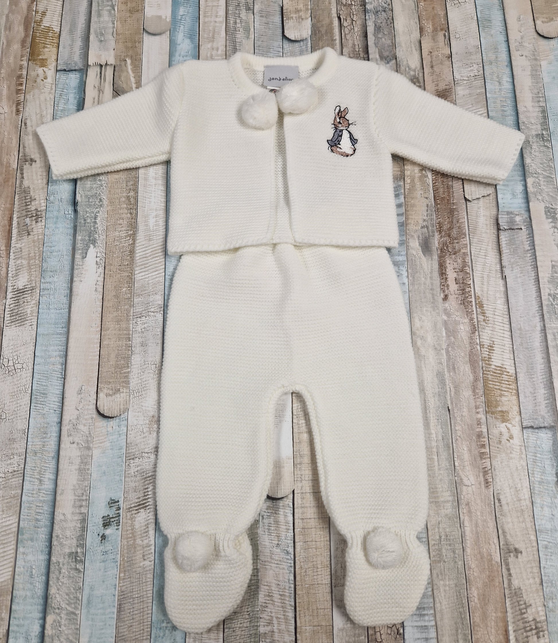 This adorable set for baby includes a knitted beige cardigan with a charming embroidered rabbit design and matching bottoms with pom poms on the feet.