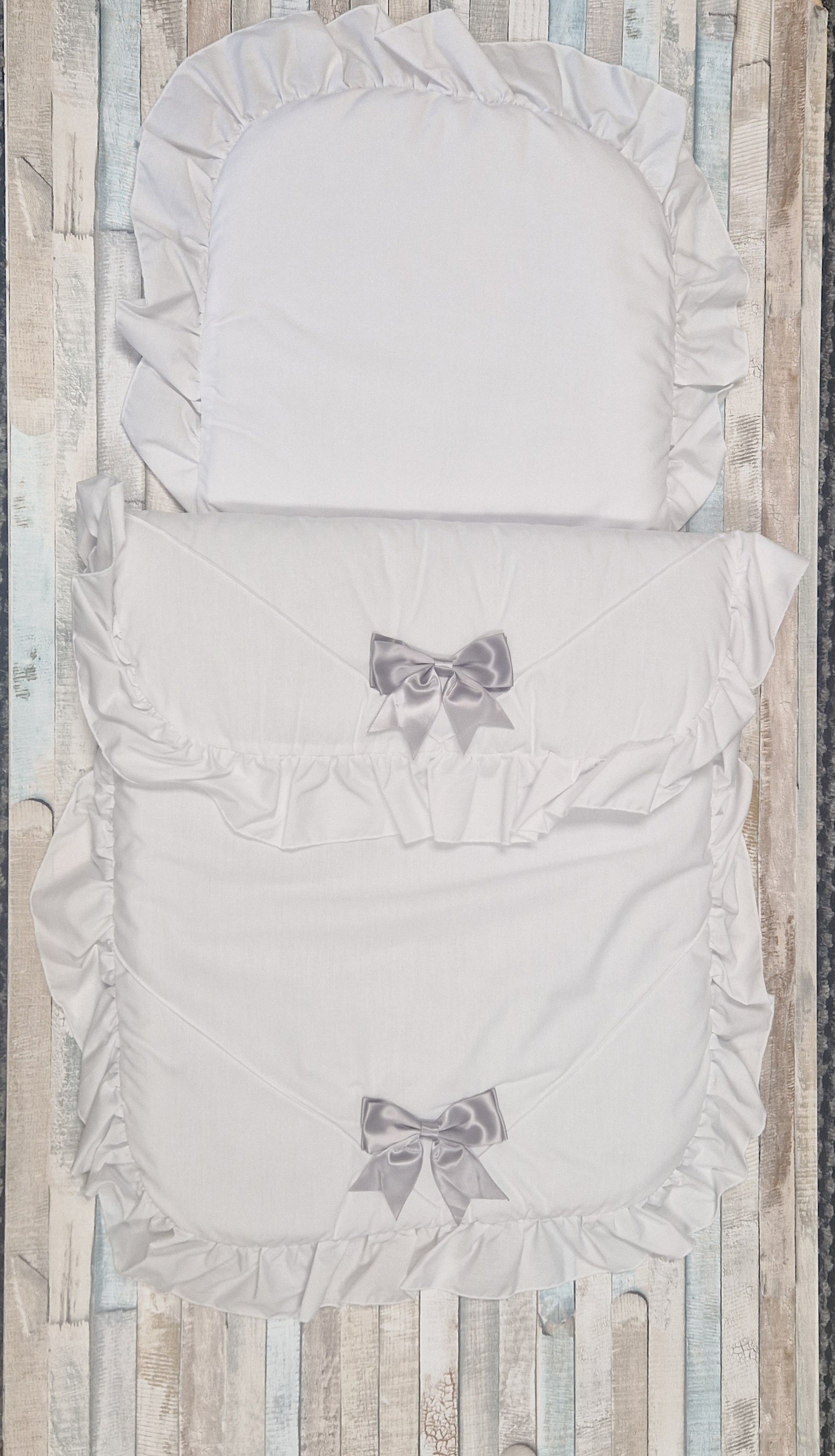 White Broderie Frill 2 Grey Satin Bow Pram Set